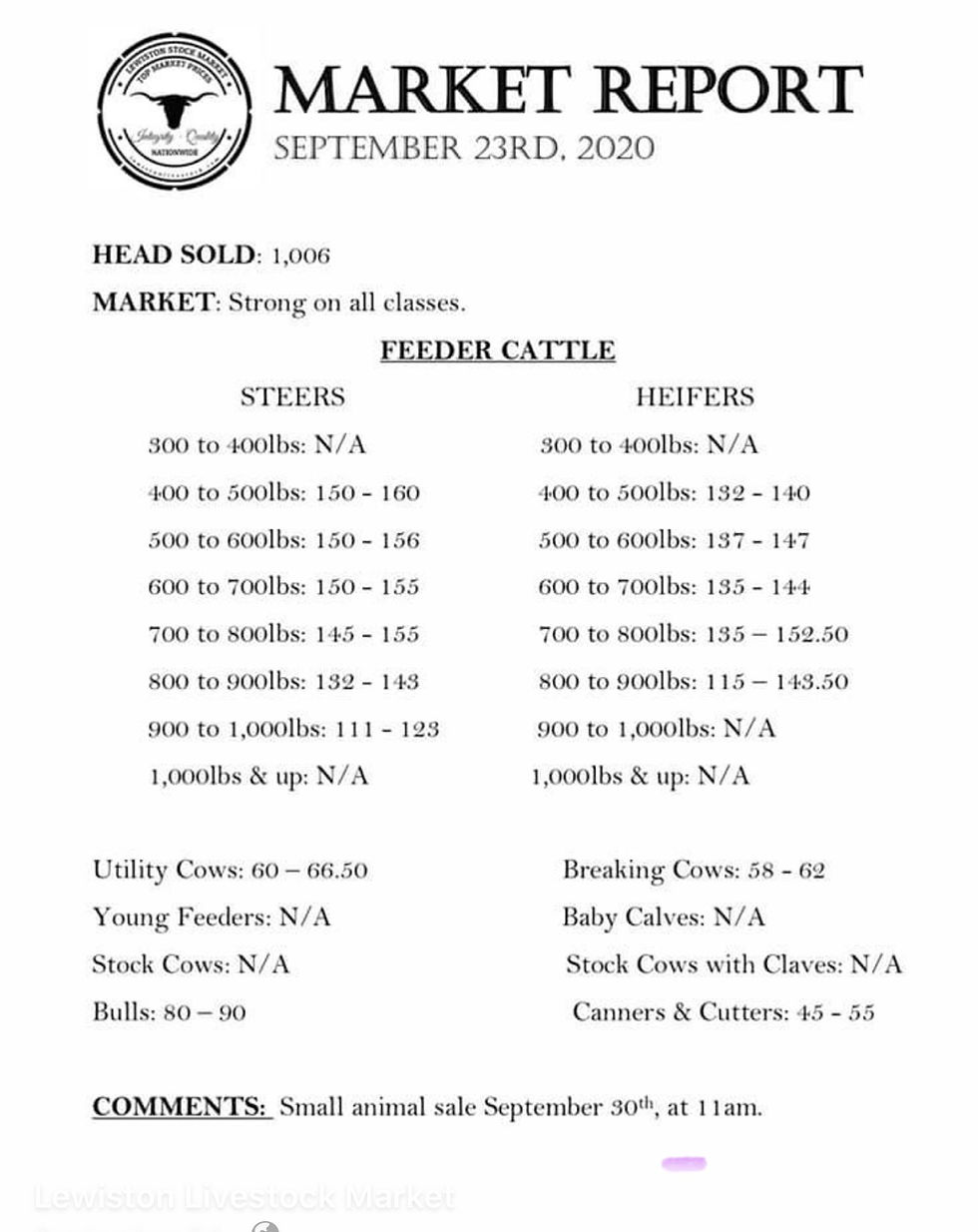 September 23rd, 2020 Special Feeder Sale